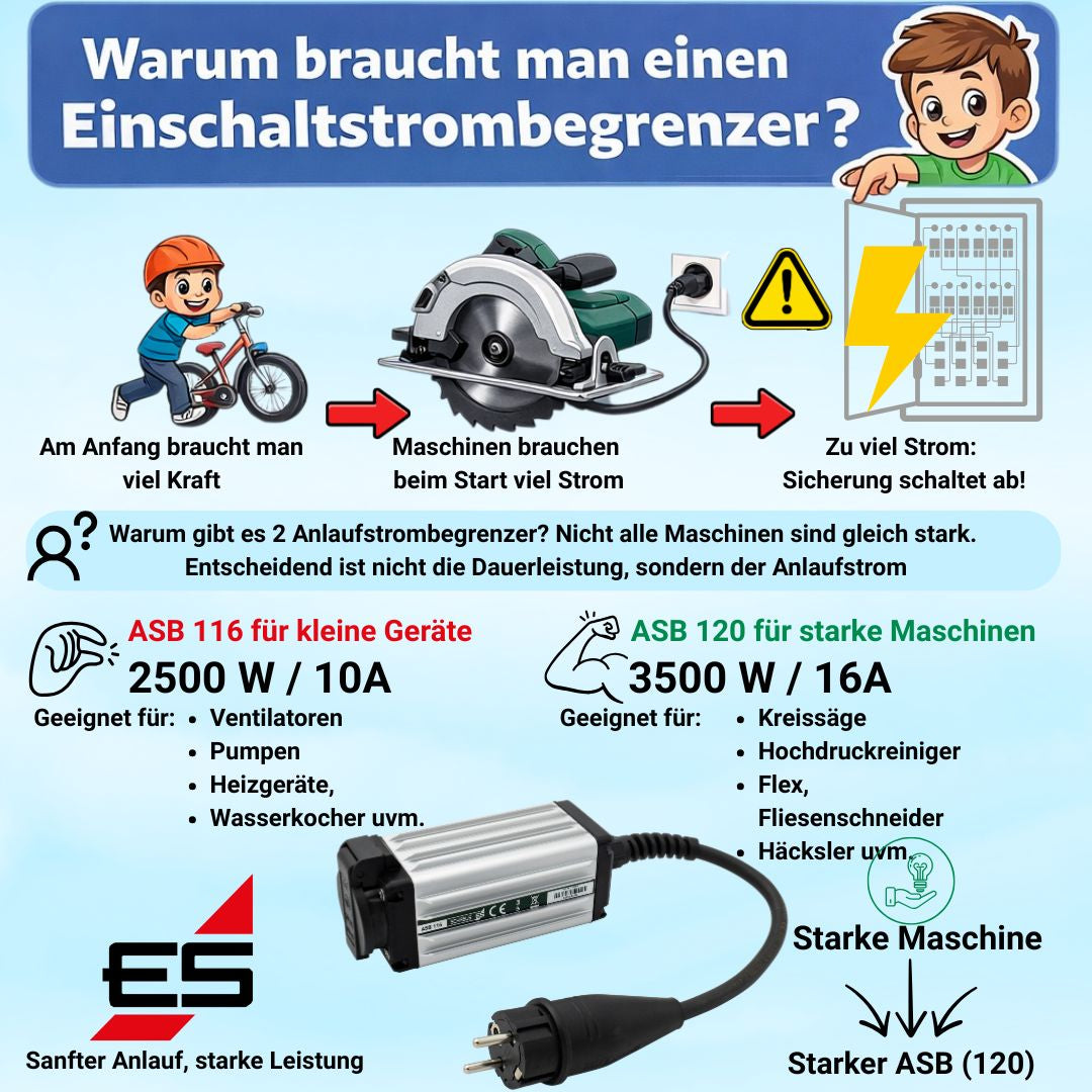 يُستخدم مُحدِّد تيار بدء التشغيل ASB 116 مع محركات التيار المتردد والأدوات الكهربائية التي تعمل في وضع الخمول. يمنع هذا المُحدِّد الإلكتروني للتيار قاطع الدائرة الكهربائية المنزلية في صندوق توصيل الطاقة من الانقطاع بسبب تيارات الاندفاع العالية. كما يُناسب مُحدِّد تيار بدء التشغيل محركات المكثفات والمحولات الكبيرة ومصابيح الهالوجين. يُناسب ASB التشغيل على شبكة الكهرباء العامة فقط.