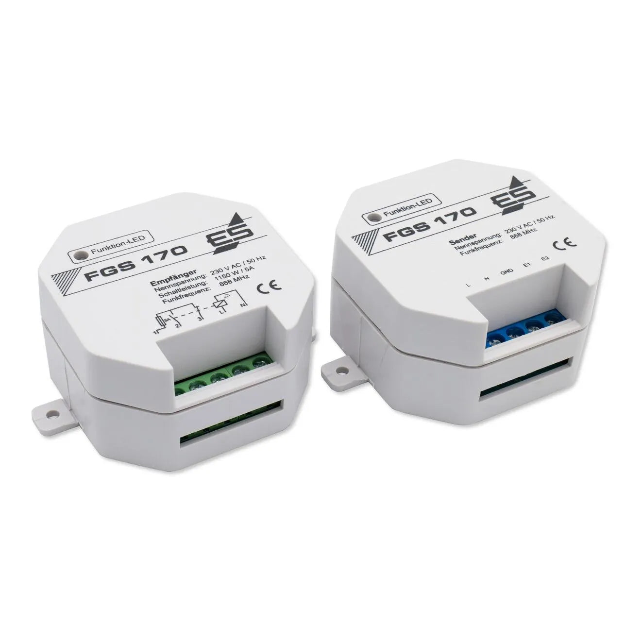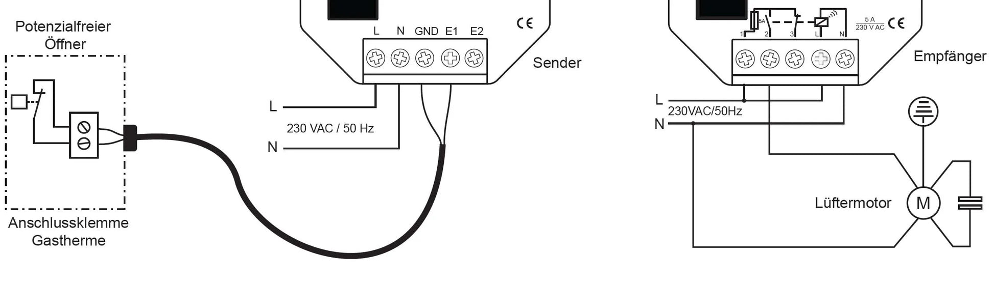 Die Steuerung besteht aus einem Sender und einem Empfänger. Der Sender wird mit dem potentialfreien Ausgang der Gastherme (Öffner oder Schließer) verbunden. Sobald die Therme zündet, ändert sich der Kontaktzustand – das Signal wird per Funk an den Empfänger übertragen. Dieser schaltet daraufhin die Stromzufuhr zur Abluftanlage ab.
