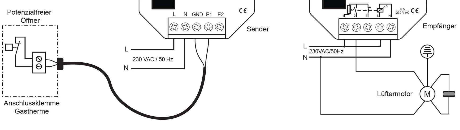 Der Sender wird mit einem Kabel am potentialfreien Kontakt (Öffner) der Gastherme angeschlossen. Sobald die Verbrennung startet und der Kontakt sich öffnet, wird über Funk ein Empfänger angesteuert, der das Abluftsystem (z. B. Badlüfter) ausschaltet. Der Empfänger kann Auf- oder Unterputz in einer Verteiler-, Schalter- oder Steckdose mit mind. 60 mm Ø eingebaut werden. Die seitlichen Befestigungslaschen am Empfänger können bei Bedarf weggebrochen werden.*Achten Sie darauf, dass die Funkwellen nicht abgeschirmt (Mauer, Metall ...) werden, die Reichweite ist abh. von der Installation.
