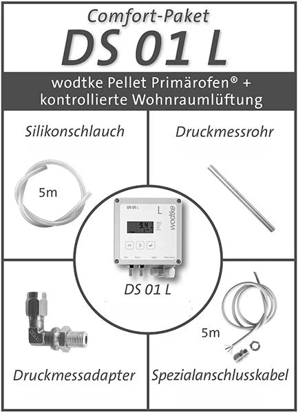 DS 01 L Comfort-Paket für Pellet Primärofen Geeignet für die Überwachung des gleichzeitigen Betriebs von kontrollierten Lüftungsanlagen und Wodtke Pellet Primäröfen. Lieferumfang