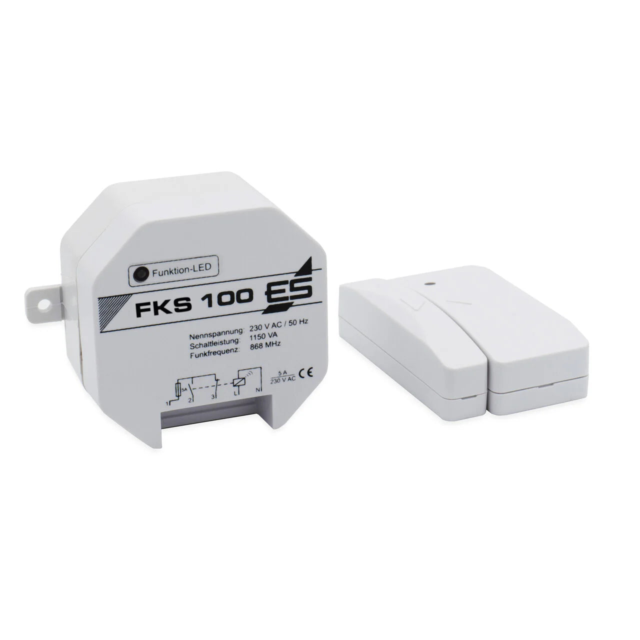 Der Sender des FKS 100 Sets überwacht die Fensterstellung und übermittelt die Information per Funk an einen Einbau Empfänger mit potentialfreiem 5-A-Wechselrelais. So kann eine Klimaanlage bei gekipptem oder geöffnetem Fenster automatisch ausgeschaltet werden, damit nicht die Außenluft gekühlt und damit unnötig Energie verschwendet wird.