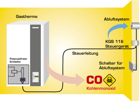 Die Steuerungseinheit wird fest mit dem potentialfreien Kontakt der Gastherme verbunden (Schließer). Sobald die Therme zündet, erkennt die KGS 116 den geänderten Kontaktzustand und unterbricht die Stromzufuhr zur angeschlossenen Abluftanlage.