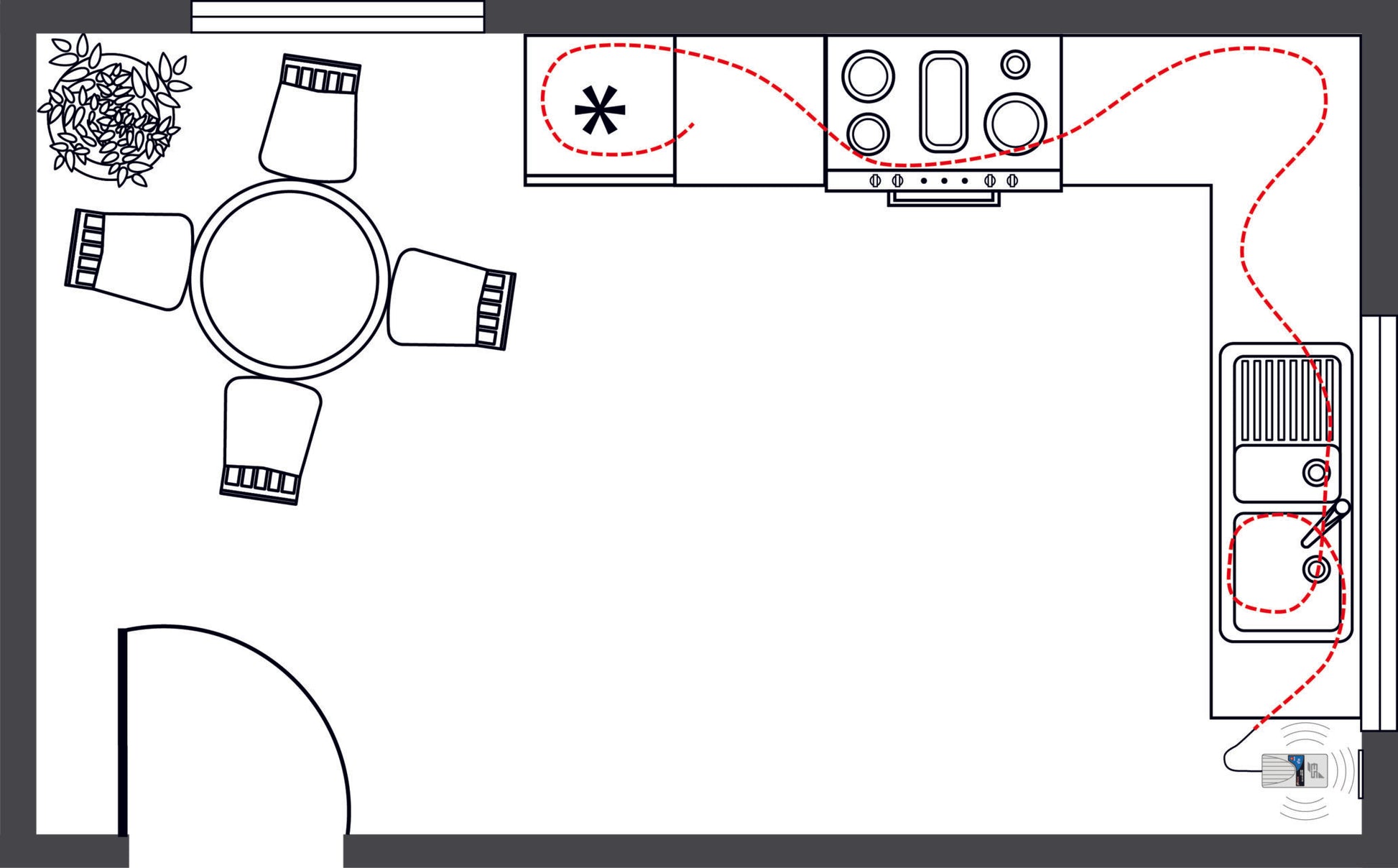 đ EinbaukĂŒchen und Badmöbel: Das Sensorkabel wird flĂ€chig auf dem Boden verlegt und erkennt Wasserlachen unter SchrĂ€nken oder Möbeln.