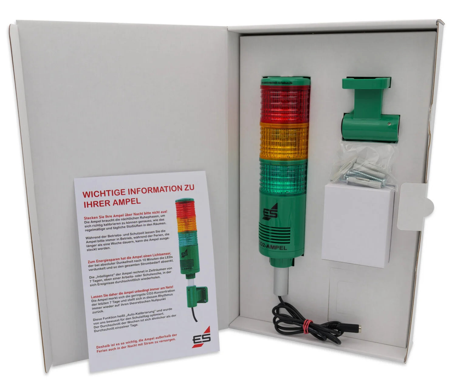 Stecken Sie Ihre Ampel über Nacht bitte nicht aus! Die Ampel nutzt die nächtlichen Ruhephasen um sich richtig zu kalibrieren – genauso wie beim regelmäßigen, täglichen Stoßlüften in den Räumen. Deshalb lassen Sie bitte die Ampel während der Betriebs- und/oder Schulzeiten dauerhaft eingeschaltet, also am Netz. Die Ampel merkt sicht die geringste CO2-Konzentration der letzten 7 Tage und stellt sich in diesem Rhythmus immer wieder auf ihren theoretischen Nullpunkt zurück. Für diese Autokalibrierung ist der Wochendurchschnitt deutlich aussagekräftiger als ein Tagesdurchschnitt. Zum Energiesparen hat die Ampel einen Lichtsensor, der bei absoluter Dunkelheit nach 10 Minuten die LED’s verdunktelt und so den gesamten Strombedarf absenkt.