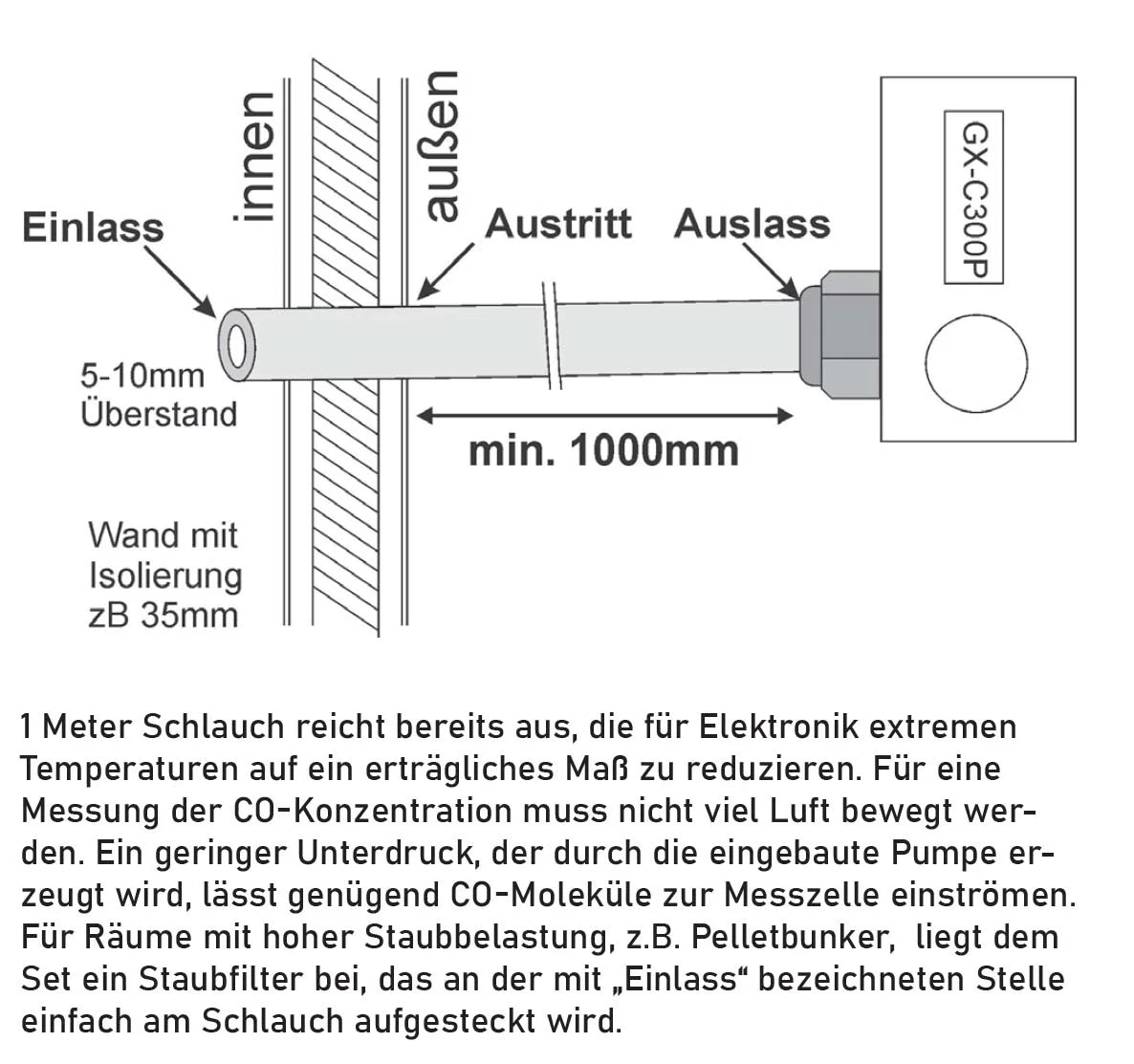 Der GX-C300P ist ein professionelles Kohlenmonoxid-Warngerät zur Festinstallation, das speziell für anspruchsvolle Umgebungen wie gasbetriebene Saunen, Kühlhäuser oder staubbelastete Räume – etwa Pellet- und Hackschnitzelbunker – entwickelt wurde. Dank seines integrierten Unterdrucksystems kann die zu überwachende Luft über einen fest installierten Silikonschlauch zuverlässig zur Messzelle geleitet werden. Dies ermöglicht eine präzise Überwachung auch in Bereichen, in denen elektrische Installationen nicht möglich oder sinnvoll sind. Das Gerät misst die CO-Konzentration exakt und zeigt den Wert in ppm auf einem beleuchteten Klartext-Display an. Bereits nach maximal 30 Sekunden liefert das System verlässliche Messergebnisse.